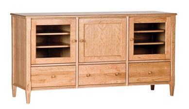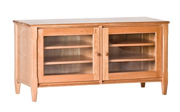 The Willow collection combines soft curves and angles for a contemporary look and feel. Starting with the slightly flared legs, the curved apron and the reverse bevelled top, and then finishing with the crescent shaped pulls which are stained a rich walnut. Glass inset panels on the soft close doors allow for remote access to your media. And, as an extra design feature, the glass on the Willow Media Cabinet is arched to mimic the curve of the apron. These pieces are constructed out of solid cherry and are made right here in MA.